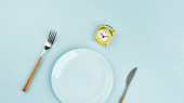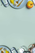 Stetoskop, glukometer i talerz z jabłkiem i ksero miejsca na kolorowym tle. Koncepcja diety cukrzycowej płaski leżak, widok z góry.