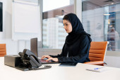 Zdjęcie "Współczesna muzułmanka pracująca w biurze ambasady dodająca informacje paszportowe o obywatelce do programu komputerowej bazy danych" może być wykorzystywane do celów osobistych i komercyjnych zgodnie z warunkami zakupionej licencji Royalty-free. Obraz jest dostępny do pobrania w jakości wysokiej rozdzielczości do 5760x3840.