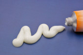 Squiggly linia złożonego białego kremu wyciskane z tubki apteki na białym tle zbliżenie.