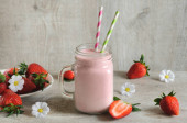 Koktajl truskawkowy w szklance ze słomkami miętowymi i truskawkami na różowym tle. Światło dzienne z kopią miejsca na tekst