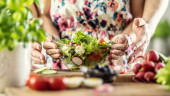Młoda kobieta trzyma zdrową sałatkę w szklanej misce.