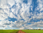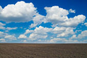 Chmury nad zaoranym polem uprawnym w ciepły słoneczny dzień. Panorama krajobrazu.