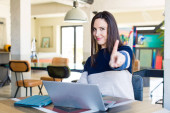 młoda dorosła ładna kobieta uśmiecha się dumnie i pewnie, czując się szczęśliwa i zadowolona i pokazując koncepcję na przestrzeni kopii
