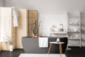 Stylowa biała wanna i drewniany stół z zestawem kosmetyków w łazience. Projekt wnętrza