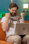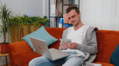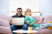 Zdjęcie "Młoda rodzina małżeństwo hippie para mężczyzna kobieta podejmowania wideo laptop konferencji telefonicznej z przyjaciółmi lub rodziną, korzystających z przyjemnej rozmowy w domu. Mąż się śmieje, macha "cześć" w pokoju" może być wykorzystywane do celów osobistych i komercyjnych zgodnie z warunkami zakupionej licencji Royalty-free. Obraz jest dostępny do pobrania w jakości wysokiej rozdzielczości do 5760x3840.