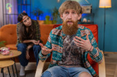 Zdjęcie "POV małżeństwa rodziny hipisowskie para mężczyzna kobieta robi selfie vlog social media videoblog, komunikując się z obserwujących śmiech patrząc na aparat dzielenie się wiadomościami, zadzwoń online. Mąż i żona razem" może być wykorzystywane do celów osobistych i komercyjnych zgodnie z warunkami zakupionej licencji Royalty-free. Obraz jest dostępny do pobrania w jakości wysokiej rozdzielczości do 5760x3840.