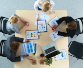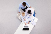 Biznesmeni siedzący i dyskutujący na spotkaniu biznesowym, w biurze
