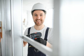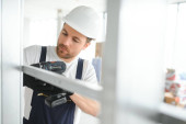 człowiek mocuj metalową ramę profilową do ściany grodzi dramaturgicznej.