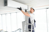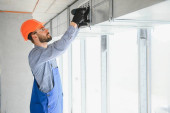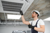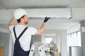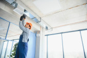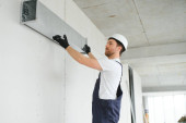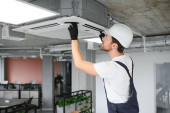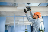 Zdjęcie "Temat przemysłowy. Instalacja systemu ogrzewania i chłodzenia magazynów przez profesjonalnego technika kaukaskiego. Prostokątne kanały wentylacyjne budynków komercyjnych. Dystrybucja powietrza" może być wykorzystywane do celów osobistych i komercyjnych zgodnie z warunkami zakupionej licencji Royalty-free. Obraz jest dostępny do pobrania w jakości wysokiej rozdzielczości do 5760x3840.