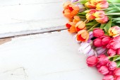 Wiosna wakacje kartka okolicznościowa tło z różnym kolorem kwiatów tulipan, pudełko z prezentami, płaskie na jasnoniebieskim wysokim kolorze drewniane tło widok z góry kopia przestrzeń