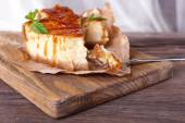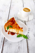 Sernik na kartce papieru na deska do krojenia na drewniane tła