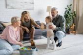 wysoki kąt widok dojrzałej pary i dziewczynka maluch w pobliżu wiklinowym koszu z zabawkami na podłodze w salonie