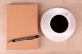 Filiżankę kawy na talerzyk z kartkę papieru i długopis na drewniany stół tło