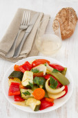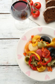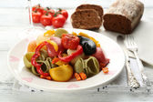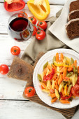 Smaczny multicolor makaron z pieprzem, marchewki i pomidory na drewniany stół tło