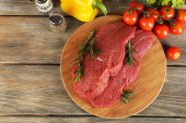 Zdjęcie "Surowy befsztyk na deski do krojenia warzyw i przypraw na drewniane tła" może być wykorzystywane do celów osobistych i komercyjnych zgodnie z warunkami zakupionej licencji Royalty-free. Obraz jest dostępny do pobrania w jakości wysokiej rozdzielczości do 5760x3840.