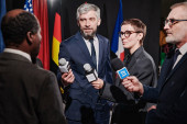 Młoda bizneswoman w okularach słucha kolegi podczas konferencji