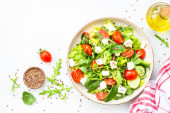 Sałatka wiosenna w talerzu. Szpinak, rukola, pomidory i feta z oliwą z oliwek. Widok z góry na biały.