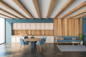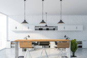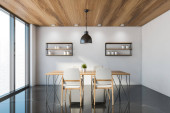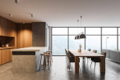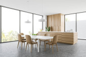 Wnętrze kuchni białej z drewnianym stołem i barem, półki z przyborami kuchennymi. Nowoczesna jadalnia z panoramicznym oknem na tropiki. Renderowanie 3D