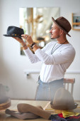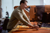 profesjonalny zamyślony rzemieślnik oznaczający ślepaki do szycia toreb. z bliska widok z boku photo.man mierzy materiał na pasek, torbę, remont skóry krawieckiej stare ubrania, akcesoria