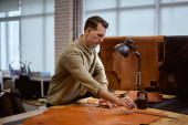 Zdjęcie "profesjonalny zamyślony rzemieślnik oznaczający ślepaki do szycia toreb. z bliska widok z boku photo.man mierzy materiał na pasek, torbę, remont skóry krawieckiej stare ubrania, akcesoria" może być wykorzystywane do celów osobistych i komercyjnych zgodnie z warunkami zakupionej licencji Royalty-free. Obraz jest dostępny do pobrania w jakości wysokiej rozdzielczości do 5760x3840.