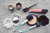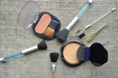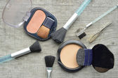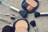 Makijaż Eyeliner brush z butelki, zestaw kosmetyków, makijażu i szczotki, proszek, puff, tusz do rzęs, eyeliner na stół z drewna