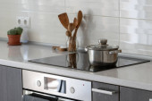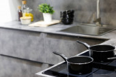 zbliżenie sosów ze stali nierdzewnej z pokrywami na szklanym elektrycznym piecu ceramicznym w nowoczesnej kuchni z czarnym marmurowym blatem i niebieską płytką na ścianie