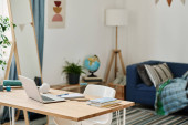 Poziomy obraz nowoczesnej sypialni z wygodnym łóżkiem i miejscem pracy z laptopem