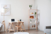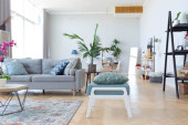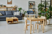 Poziomy obraz nowoczesnego salonu z wygodną sofą i stołem z laptopem do pracy online