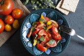 Zdjęcie "Pojęcie żywności wegańskiej lub dietetycznej. Sałatka pomidorowa zrobiona z mieszanki czerwonych i żółtych pomidorów i sera feta na kamiennym blatze. Widok z góry. " może być wykorzystywane do celów osobistych i komercyjnych zgodnie z warunkami zakupionej licencji Royalty-free. Obraz jest dostępny do pobrania w jakości wysokiej rozdzielczości do 5760x3840.