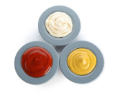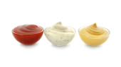 Miski ketchupu, majonezu i musztardy izolowane na białym tle
