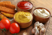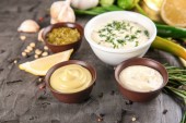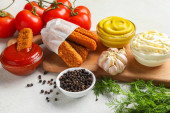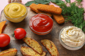 Miski z różnymi sosami, nuggetsy rybne i warzywa na białym stole, zbliżenie