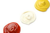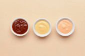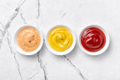 Talerze z ketchupem, majonezem i musztardą na szarym stole grunżowym