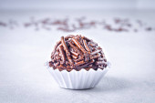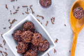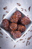 Kilka "brigadeiro" słodycze na białej misce z posypką czekolady leżącej na stole. Typowy brazylijski słodki.