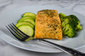 łosoś polewany miodem, podawany ze szparagami, brokułami i ziemniakami puree