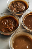 Solony sos karmelowy w szklanej misce na białym marmurowym tle. Ręka trzymająca łyżkę zanurza się w sosie karmelowym, karmel się rozciąga. Masło, cukier ze śmietaną i solą. Wysokiej jakości zdjęcie