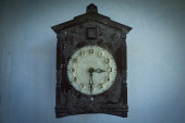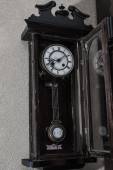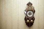 Old wooden clock with a pendulum hanging on the wall