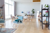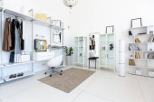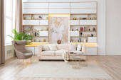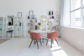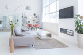 Zdjęcie "Przytulny luksusowy nowoczesny wystrój wnętrz studio apartament w bardzo białych kolorach z modnymi drogimi meblami w minimalistycznym stylu. podłoga z białego kafelka, kuchnia, strefa relaksu i miejsce pracy" może być wykorzystywane do celów osobistych i komercyjnych zgodnie z warunkami zakupionej licencji Royalty-free. Obraz jest dostępny do pobrania w jakości wysokiej rozdzielczości do 5760x3840.