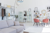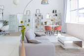 Przytulny luksusowy nowoczesny wystrój wnętrz studio apartament w bardzo białych kolorach z modnymi drogimi meblami w minimalistycznym stylu. podłoga z białego kafelka, kuchnia, strefa relaksu i miejsce pracy