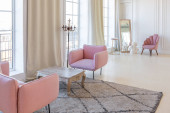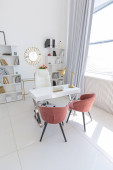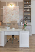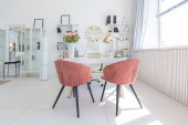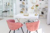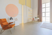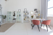 Zdjęcie "Przytulny luksusowy nowoczesny wystrój wnętrz studio apartament w bardzo białych kolorach z modnymi drogimi meblami w minimalistycznym stylu. podłoga z białego kafelka, kuchnia, strefa relaksu i miejsce pracy" może być wykorzystywane do celów osobistych i komercyjnych zgodnie z warunkami zakupionej licencji Royalty-free. Obraz jest dostępny do pobrania w jakości wysokiej rozdzielczości do 5760x3840.