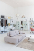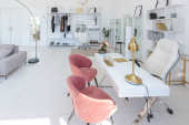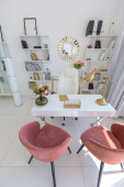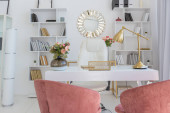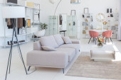 Przytulny luksusowy nowoczesny wystrój wnętrz studio apartament w bardzo białych kolorach z modnymi drogimi meblami w minimalistycznym stylu. podłoga z białego kafelka, kuchnia, strefa relaksu i miejsce pracy