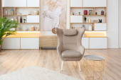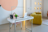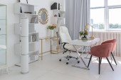 Przytulny luksusowy nowoczesny wystrój wnętrz studio apartament w bardzo białych kolorach z modnymi drogimi meblami w minimalistycznym stylu. podłoga z białego kafelka, kuchnia, strefa relaksu i miejsce pracy