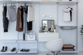 Zdjęcie "Przytulny luksusowy nowoczesny wystrój wnętrz studio apartament w bardzo białych kolorach z modnymi drogimi meblami w minimalistycznym stylu. podłoga z białego kafelka, kuchnia, strefa relaksu i miejsce pracy" może być wykorzystywane do celów osobistych i komercyjnych zgodnie z warunkami zakupionej licencji Royalty-free. Obraz jest dostępny do pobrania w jakości wysokiej rozdzielczości do 5760x3840.