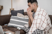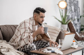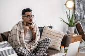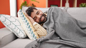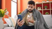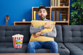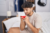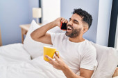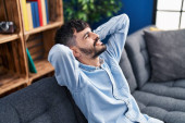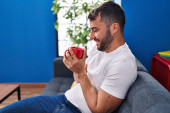 Zdjęcie "Młody Latynos pije kawę siedząc na kanapie." może być wykorzystywane do celów osobistych i komercyjnych zgodnie z warunkami zakupionej licencji Royalty-free. Obraz jest dostępny do pobrania w jakości wysokiej rozdzielczości do 5760x3840.