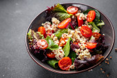 sałatka quinoa, pomidor, zielona sałata mieszanka zdrowy posiłek jedzenie przekąska na stole kopia przestrzeń jedzenie tło rustykalny widok z góry