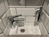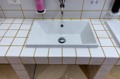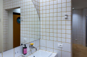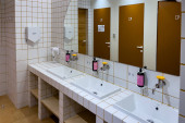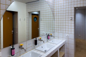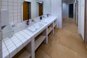 Zdjęcie "Czysta nowoczesna wspólna łazienka wewnątrz hostelu" może być wykorzystywane do celów osobistych i komercyjnych zgodnie z warunkami zakupionej licencji Royalty-free. Obraz jest dostępny do pobrania w jakości wysokiej rozdzielczości do 5760x3840.