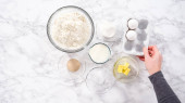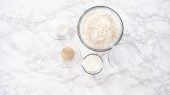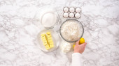 Leżeć płasko. Składniki do pieczenia bułek brioche na stole kuchennym.