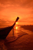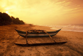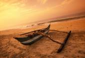 drewniana łódź rybacka na piaszczystej plaży z krajobrazem i wybrzeżem w mieście Vagator w prowincji Goa w Indiach, Indiach, Goa, kwiecień 1996