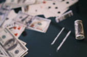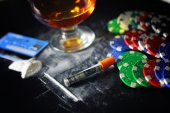 Karty do gry w pokera, alkohol w szklance, białe pigułki, proszek i dolara amerykańskiego waluty na ciemnym tle. Pojęcie uzależnienia, hazardu i nadużyć.