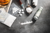 Leki biała pigułka, strzykawka z dawką substancji odurzających, biały proszek kokaina, napój alkoholowy w szklance i dolara amerykańskiego waluty na ciemnym tle. Pojęcie uzależnienia, nadużycia i złych nawyków.