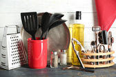 Kitchen table, kitchen utensils, cooking pots with wooden cutting board, white modern interior.